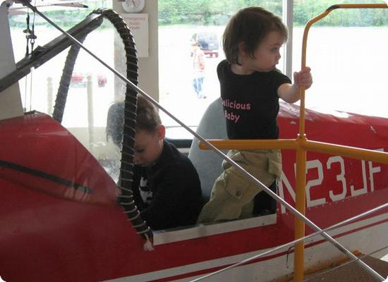 In this picture E and D are climbing into one of the small planes in the children's area. Stairs with handrails make it easy for even young toddlers (like D) to get in and out on their own. The plane's control's still work, and E was absolutely fascinated to see the tail rudder move as he worked the controls.
