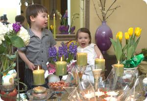 Families prepare for weeks for No Ruz, cleaning house, baking pastries, and preparing a special table with symbolic items called a Haft Sin Table (meaning a table with seven dishes each beginning with the Persian letter Sin). Each family's table is unique, and people go to great lengths to make it beautiful. This year was the first year that E was old enough to help prepare the table. His Grandmother had started growing the sprouts weeks ago, but he decorated eggs and helped by feeding the goldfish that took center stage on the table. He was impressed with the mounds of cookies and all the sweet smelling flowers that also decorated the table.